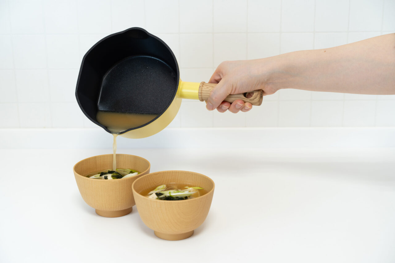 ココミッケは、お鍋を立てて収納できるように一部分が平らになっていて、自立します。