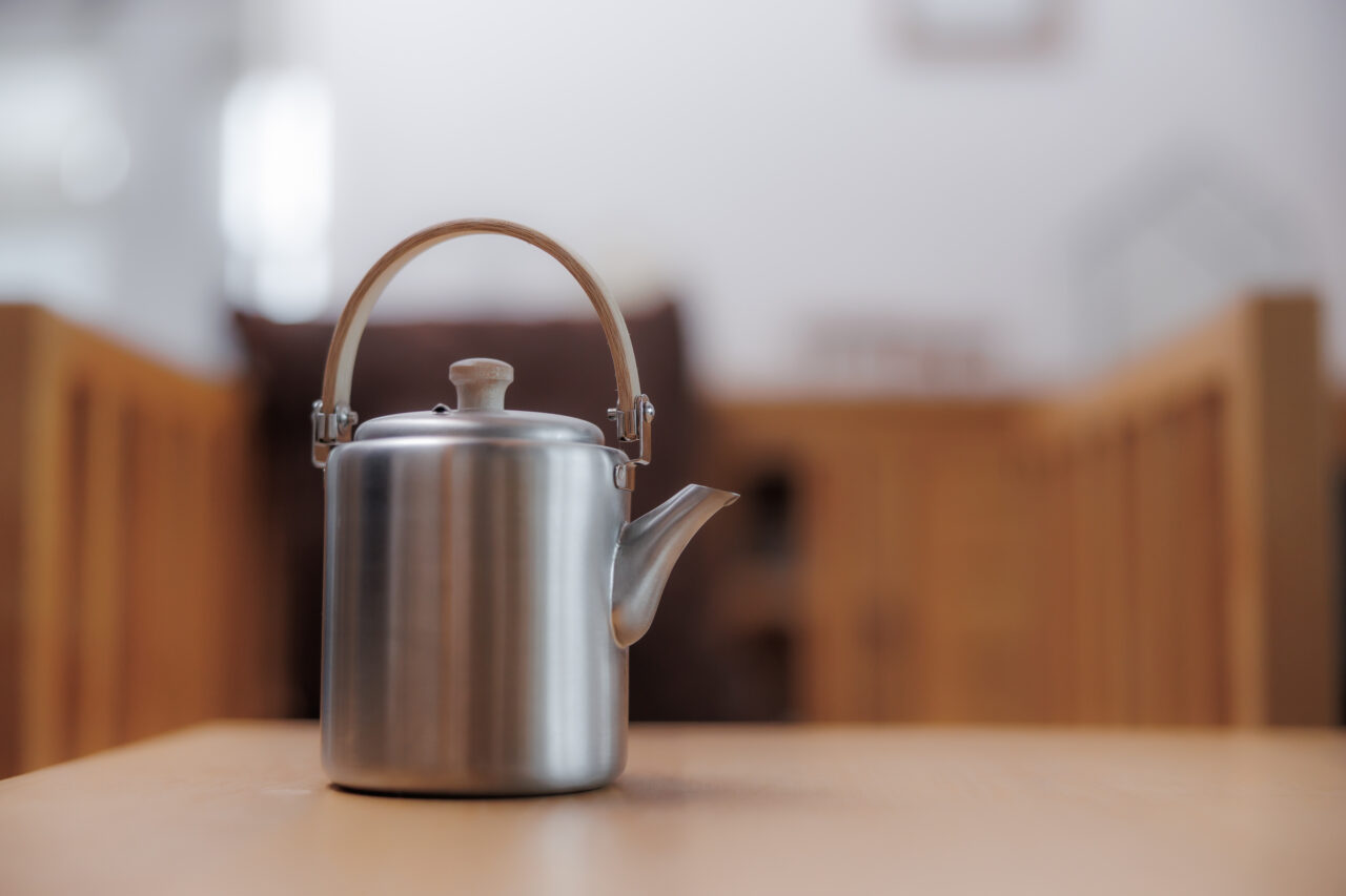2026.01.26 我が家の定番。ツヤ消しのステンレス、スッとした本体に孟宗竹の弦手。ポットだけど急須に使っている工房アイザワのストレートポット。