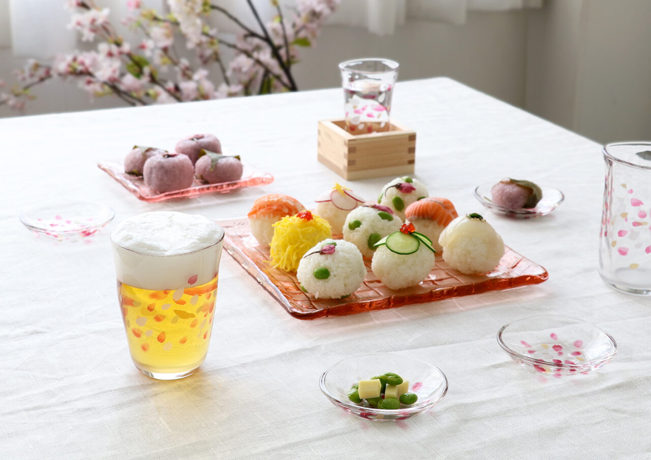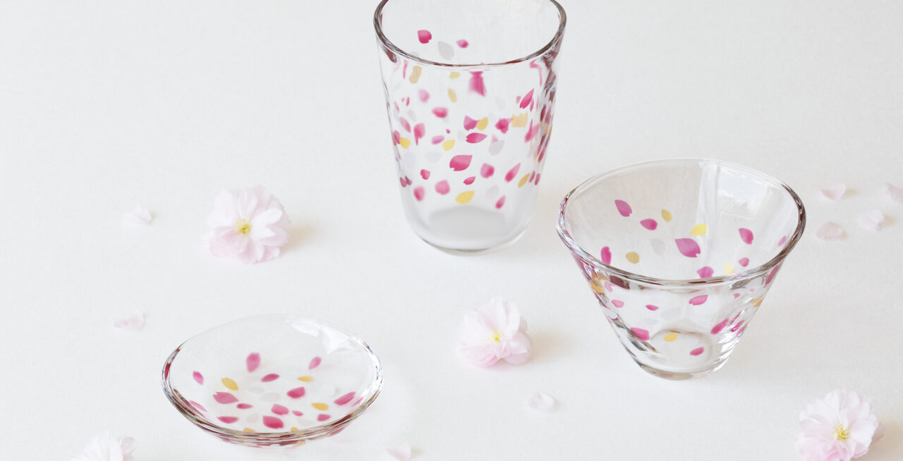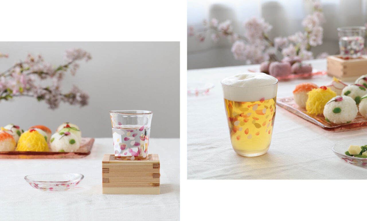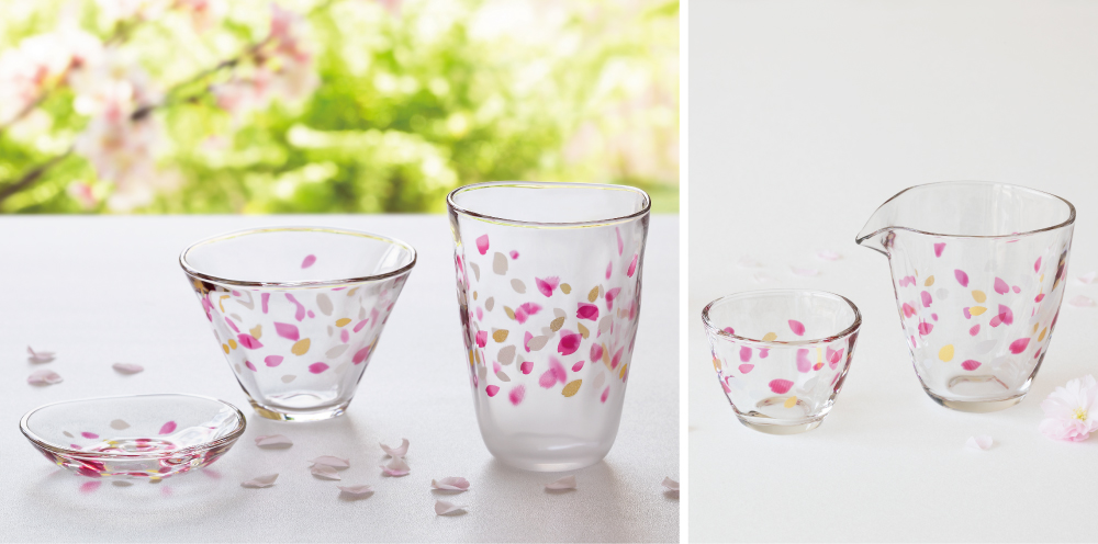 ビールグラスや日本酒の器、豆皿など色々なアイテムがあるのでお酒に合わせて選んでいただけます。さくらの名所に舞う花びらをイメージした器です。