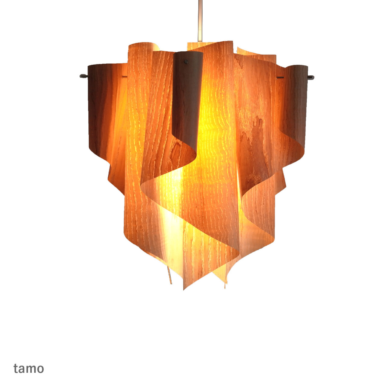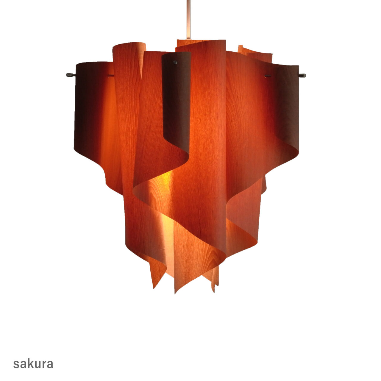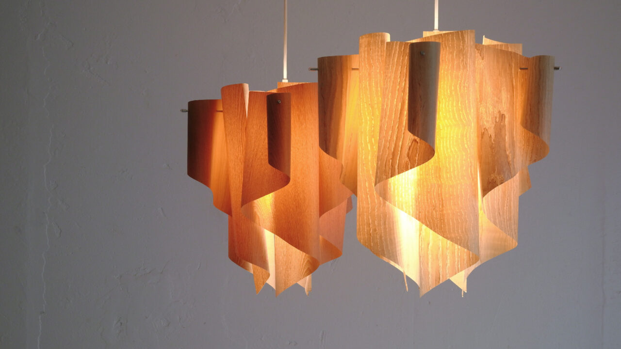 シェードには国産のサクラ材とタモ材を使用。美しい木目を透した光は、やわらかくオレンジがかった温かみのある光となり、空間にやすらぎを与えます。天然木を極薄にスライスし、特殊な下地加工を施すことで、軽やかなカーブを実現しております。