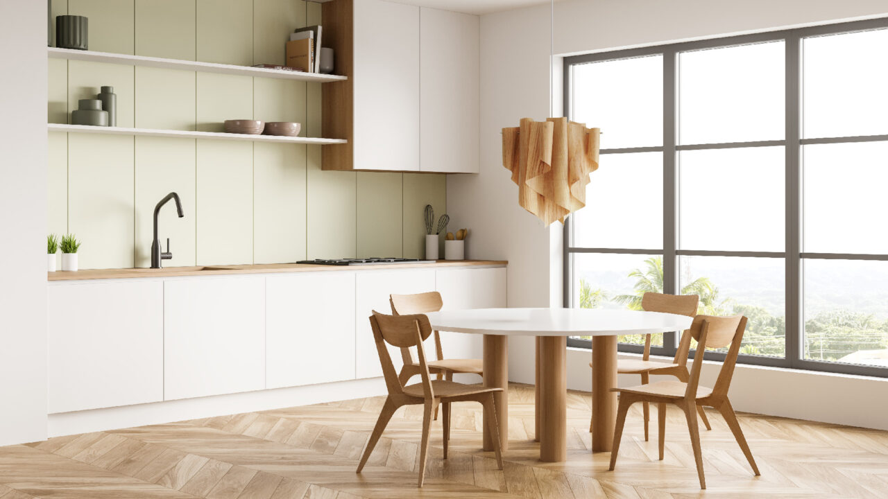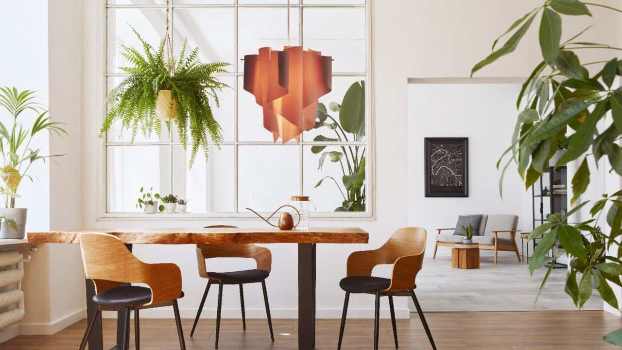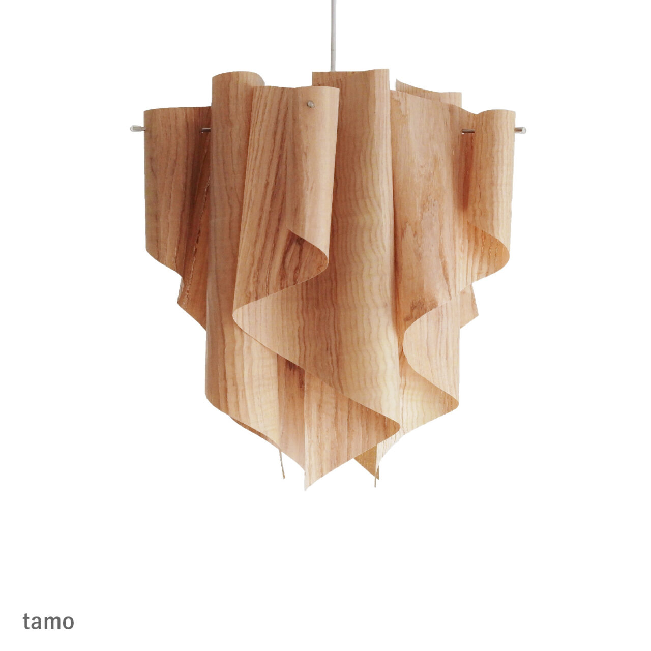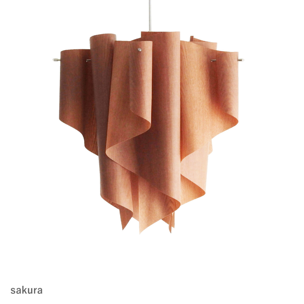 シェードには国産のサクラ材とタモ材を使用。美しい木目を透した光は、やわらかくオレンジがかった温かみのある光となり、空間にやすらぎを与えます。天然木を極薄にスライスし、特殊な下地加工を施すことで、軽やかなカーブを実現しております。