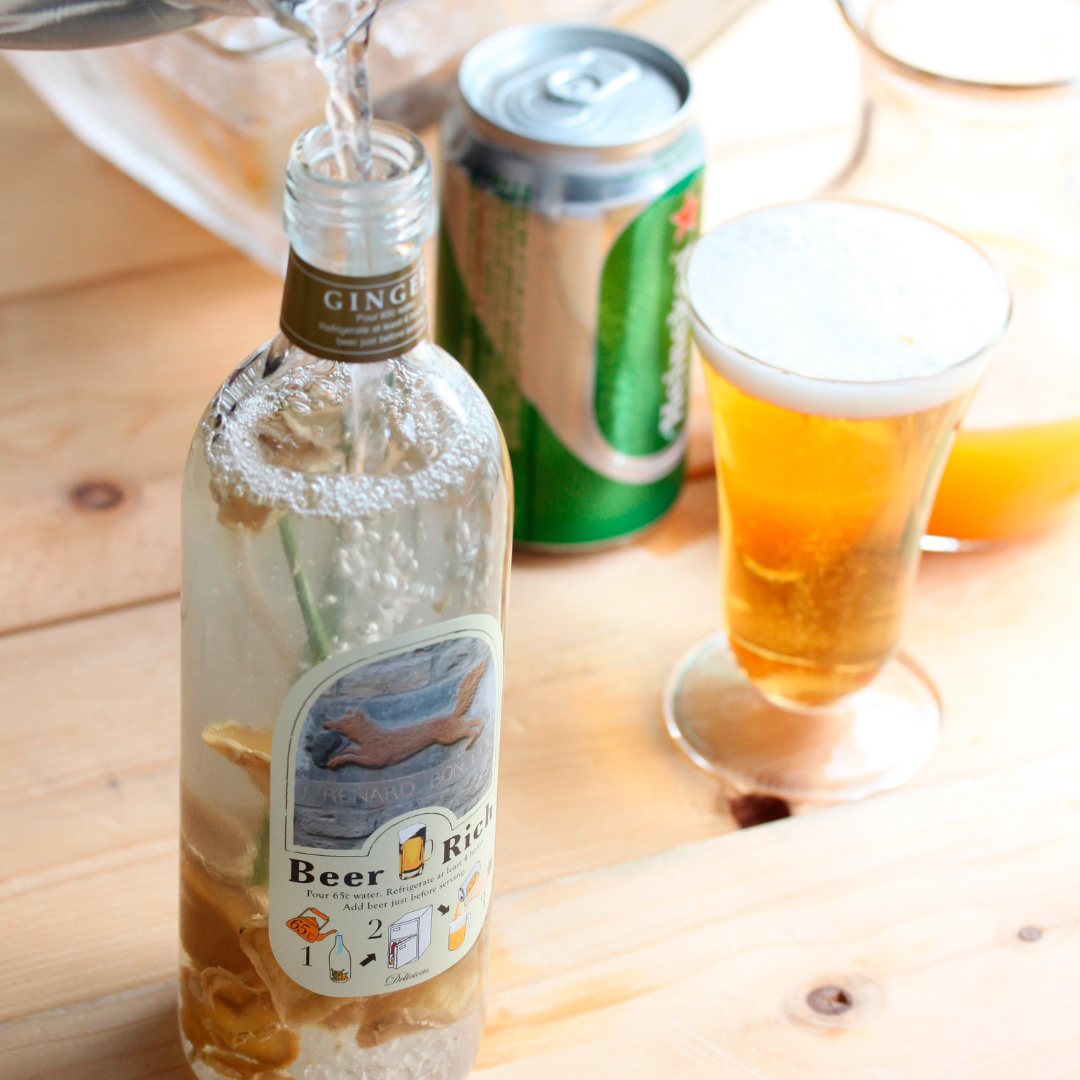 ・瓶にスパイスなどが入っています。お湯をいれて数時間置くとピリリとジンジャーのきいたシロップが出来上がります。冷やしてお好みのビールに適量入れて簡単ビアカクテルをお楽しみください。