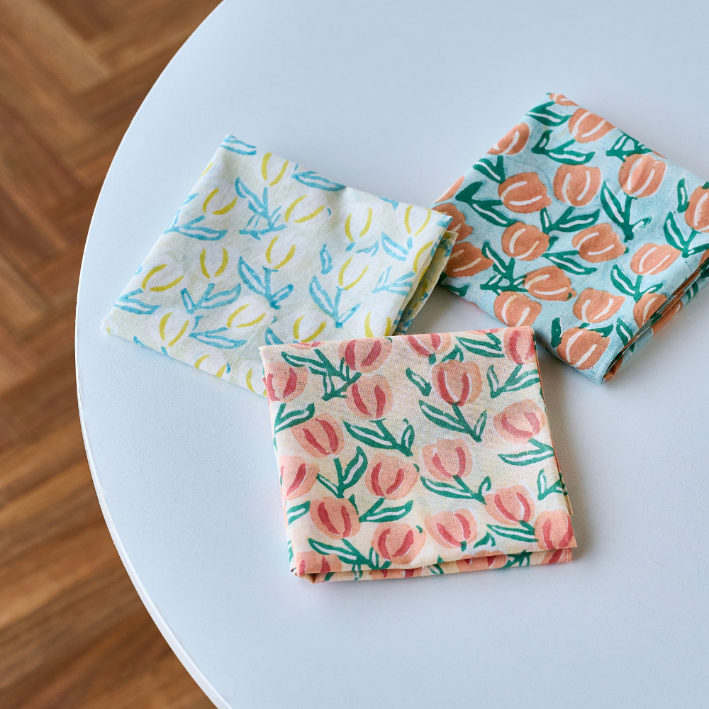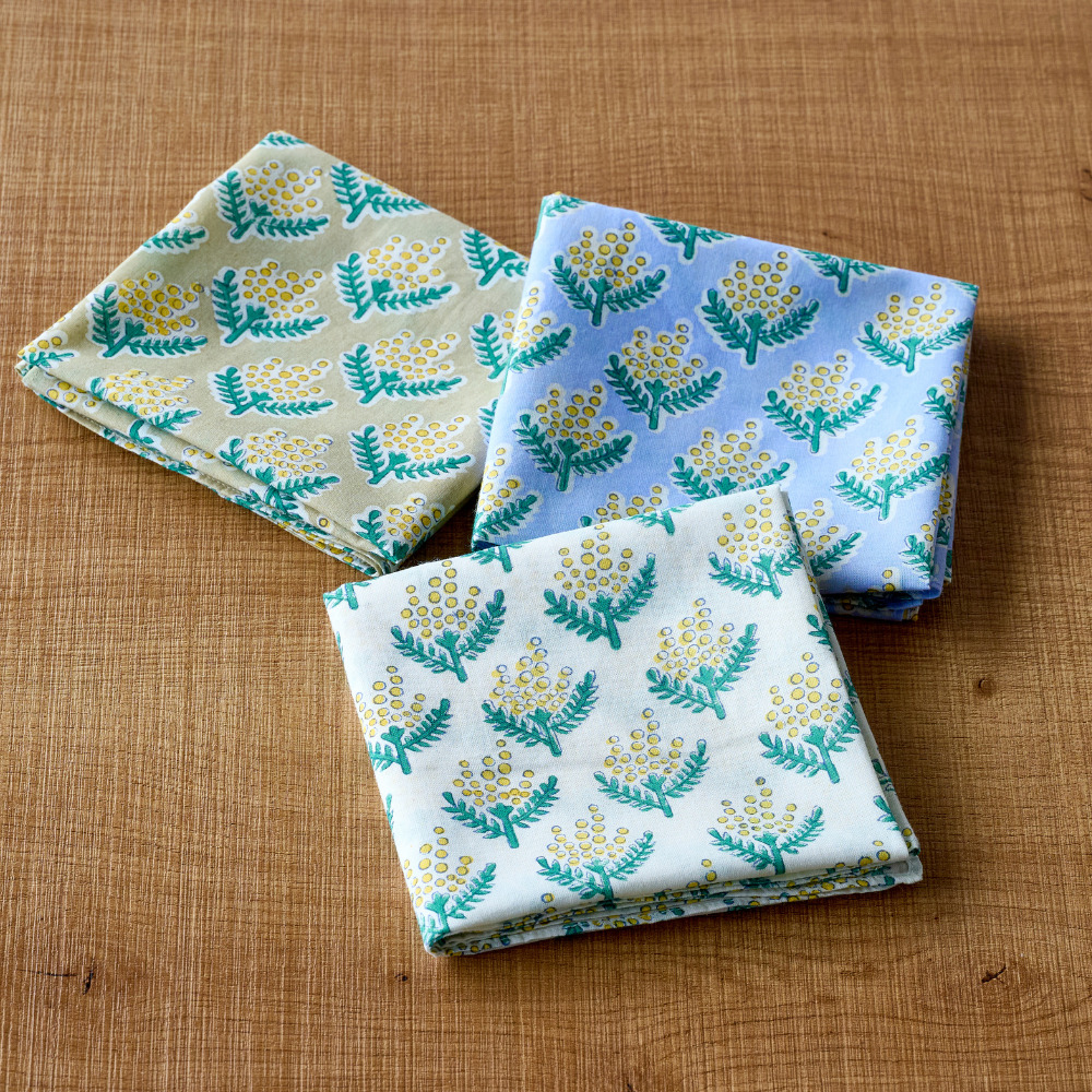 春の訪れを感じさせてくれる、インドの伝統技法「ブロックプリント」で表現された花たちが可愛いハンカチをご紹介します。