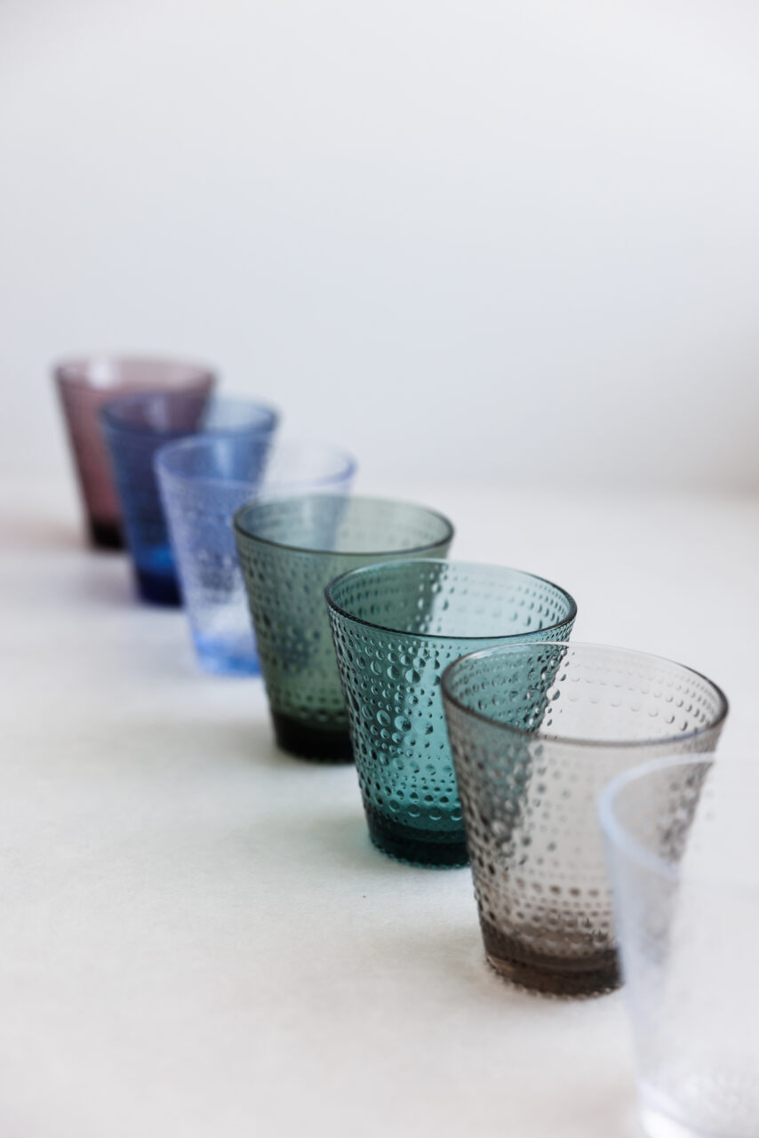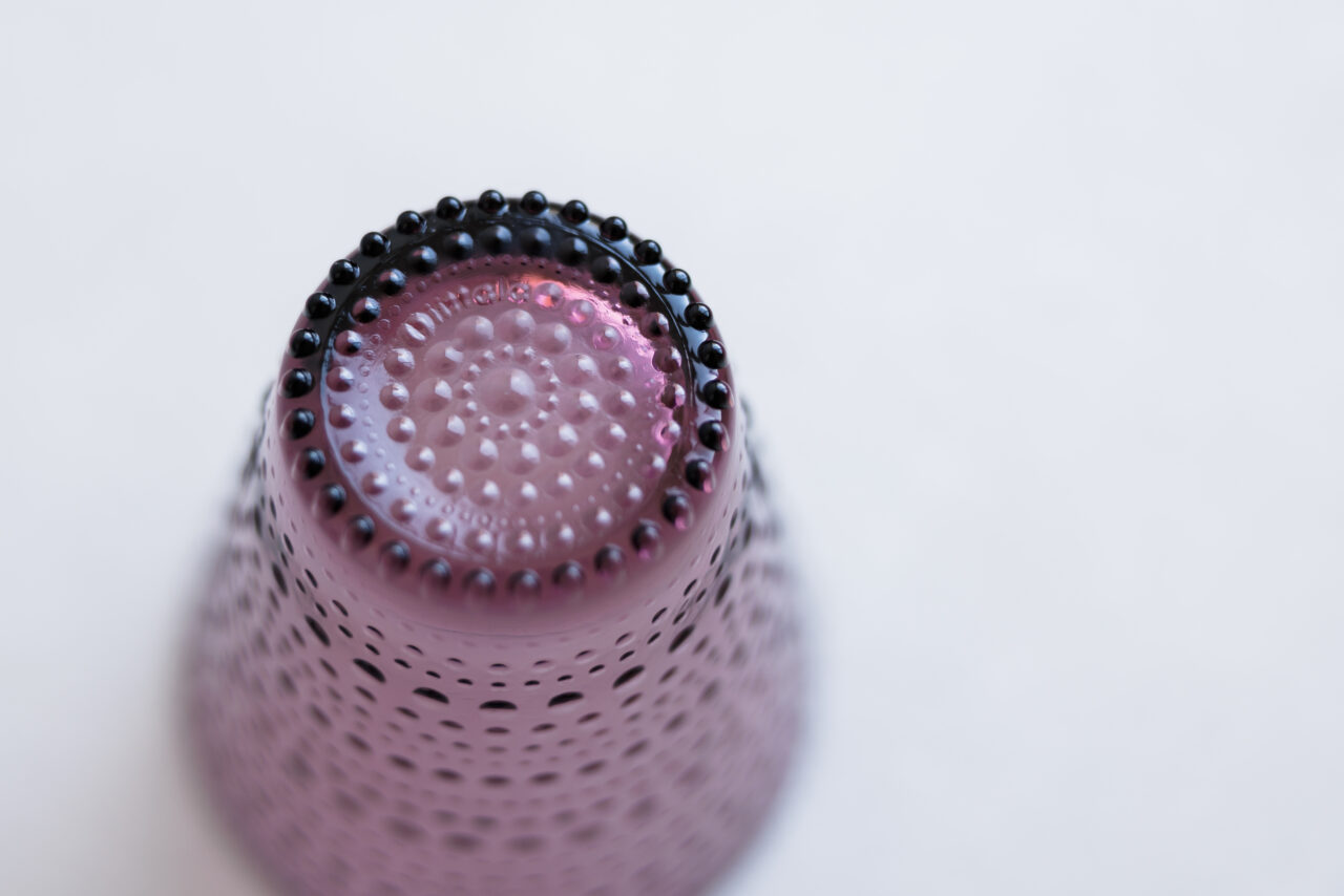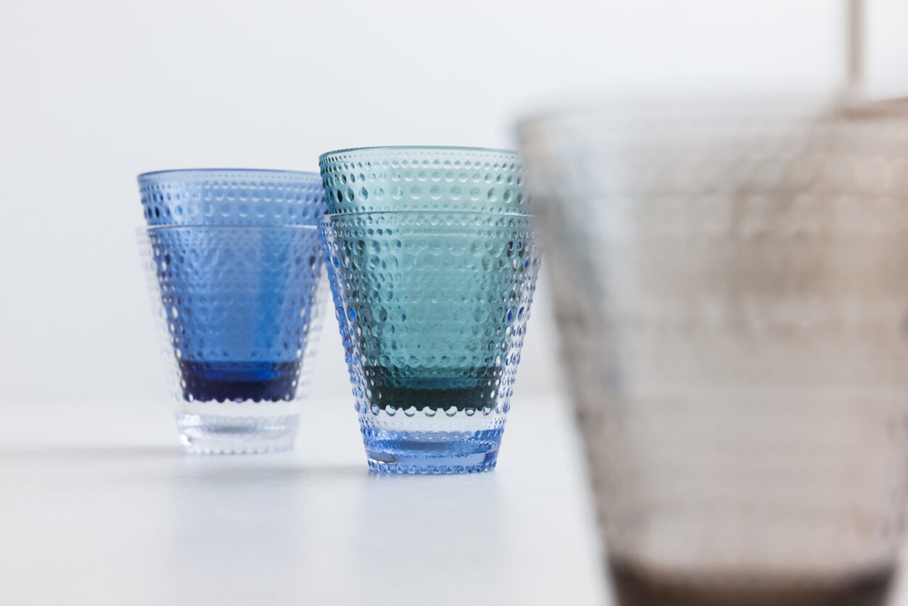 弊社が取り扱っているグラスの中で最も売れているのがKastehelmi(カステヘルミ)、フィンランド語で「露のしずく」という意味です。朝日を浴びて、まるで連なる真珠のようにきらめく朝露にインスピレーションを得て、1964年にOiva Toikka(オイバ・トイッカ)によりデザインされました。連なるガラスのしずくのようなデコレーションが、輝くガラスの美しさを際立たせています。